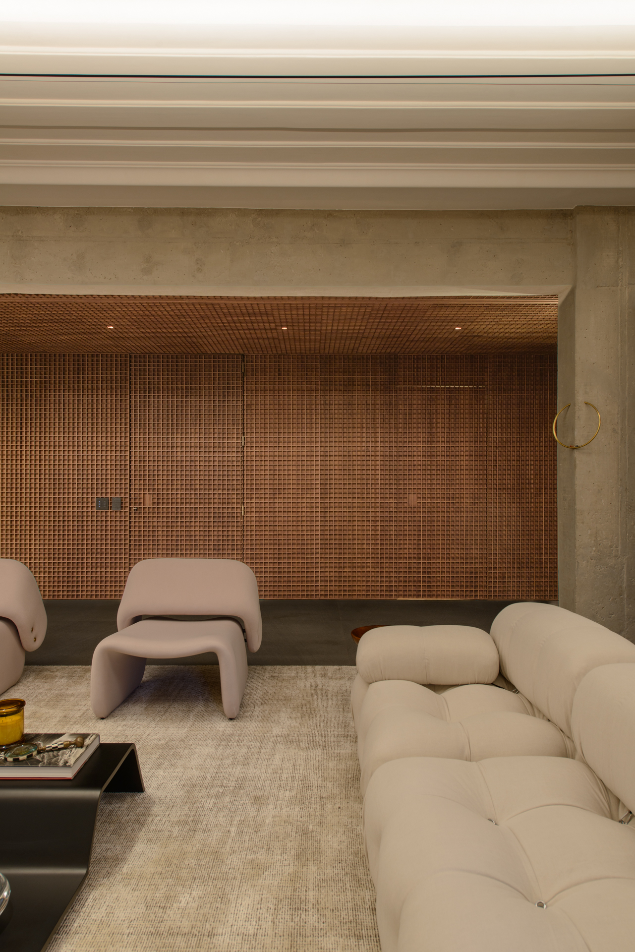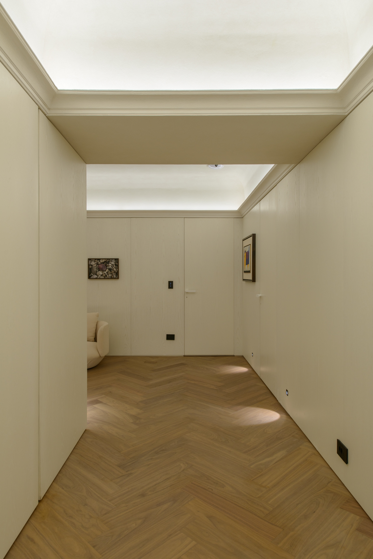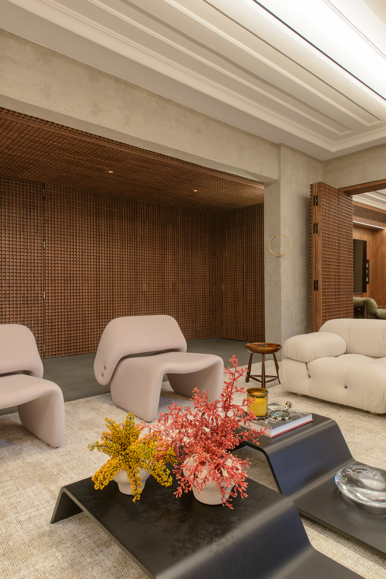 Perfis lineares embutidos percorrem os tetos com rigor geométrico, criando uma sensação de eixo visual contínuo.