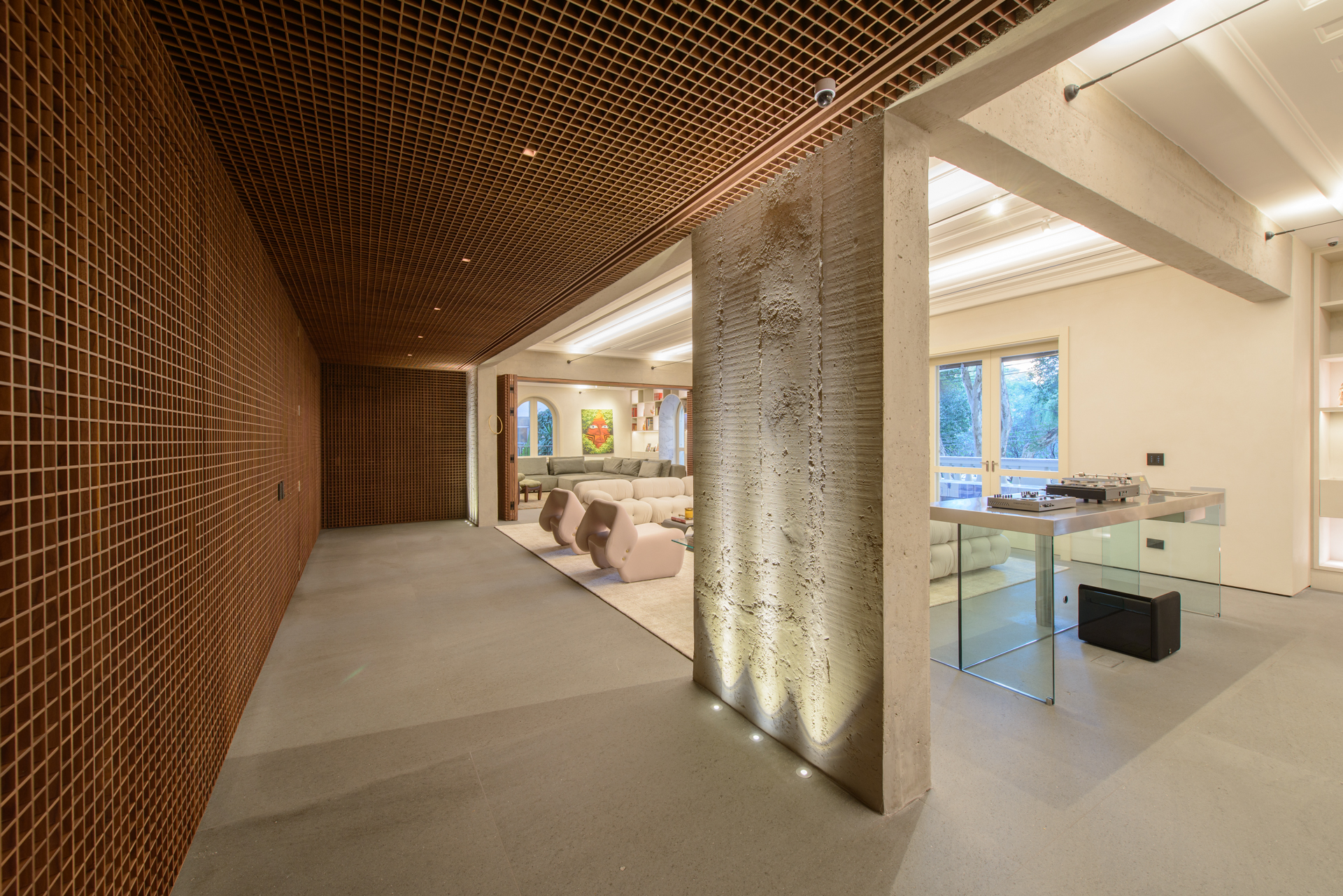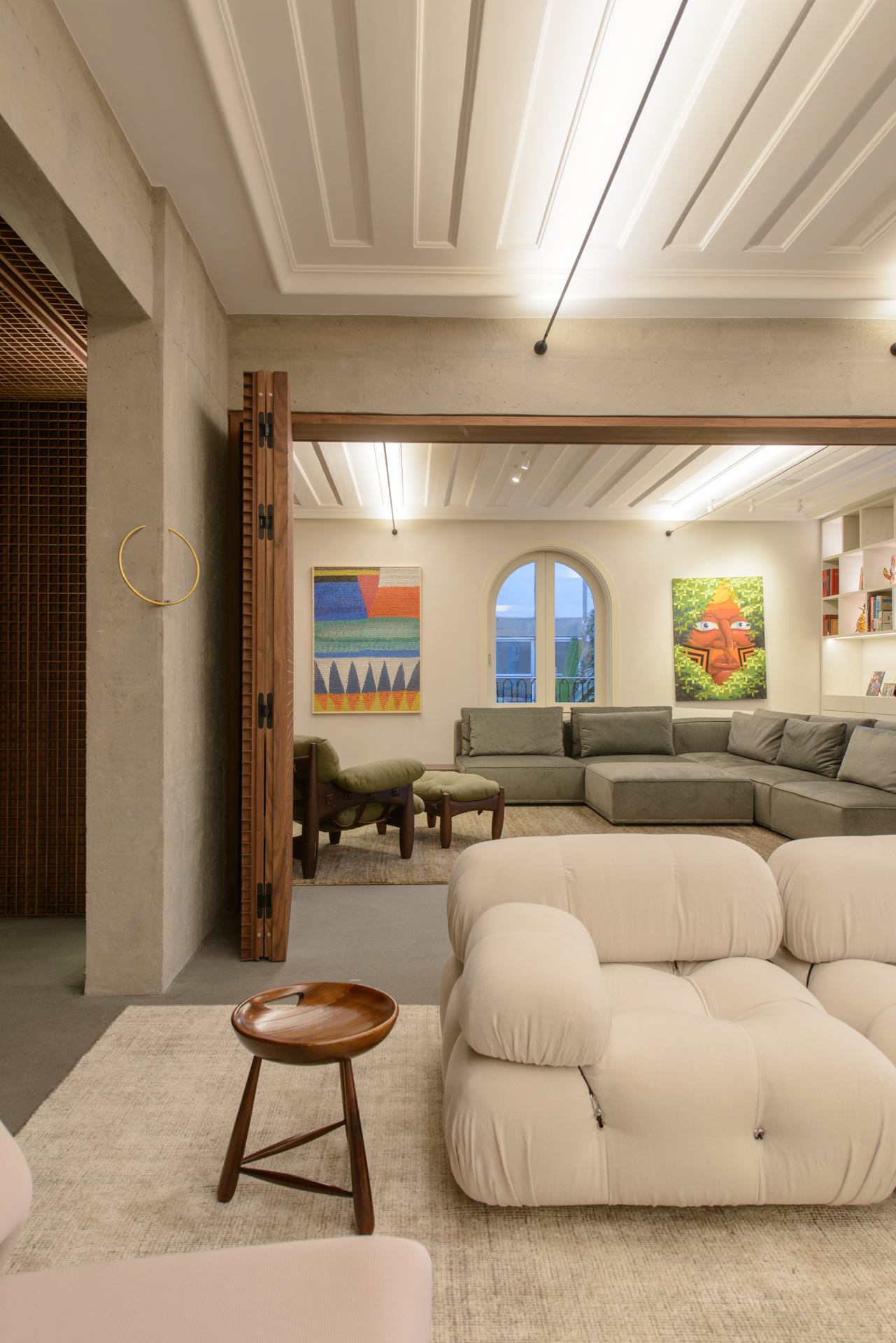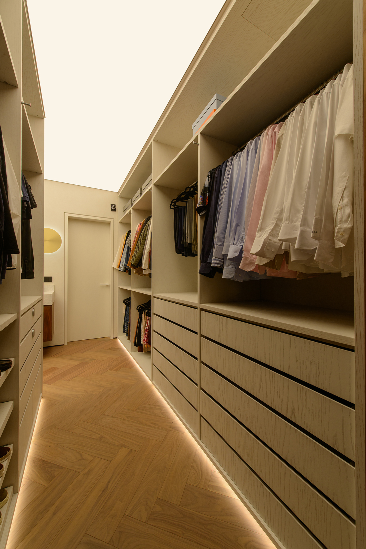 Perfis lineares embutidos percorrem os tetos com rigor geométrico, criando uma sensação de eixo visual contínuo.