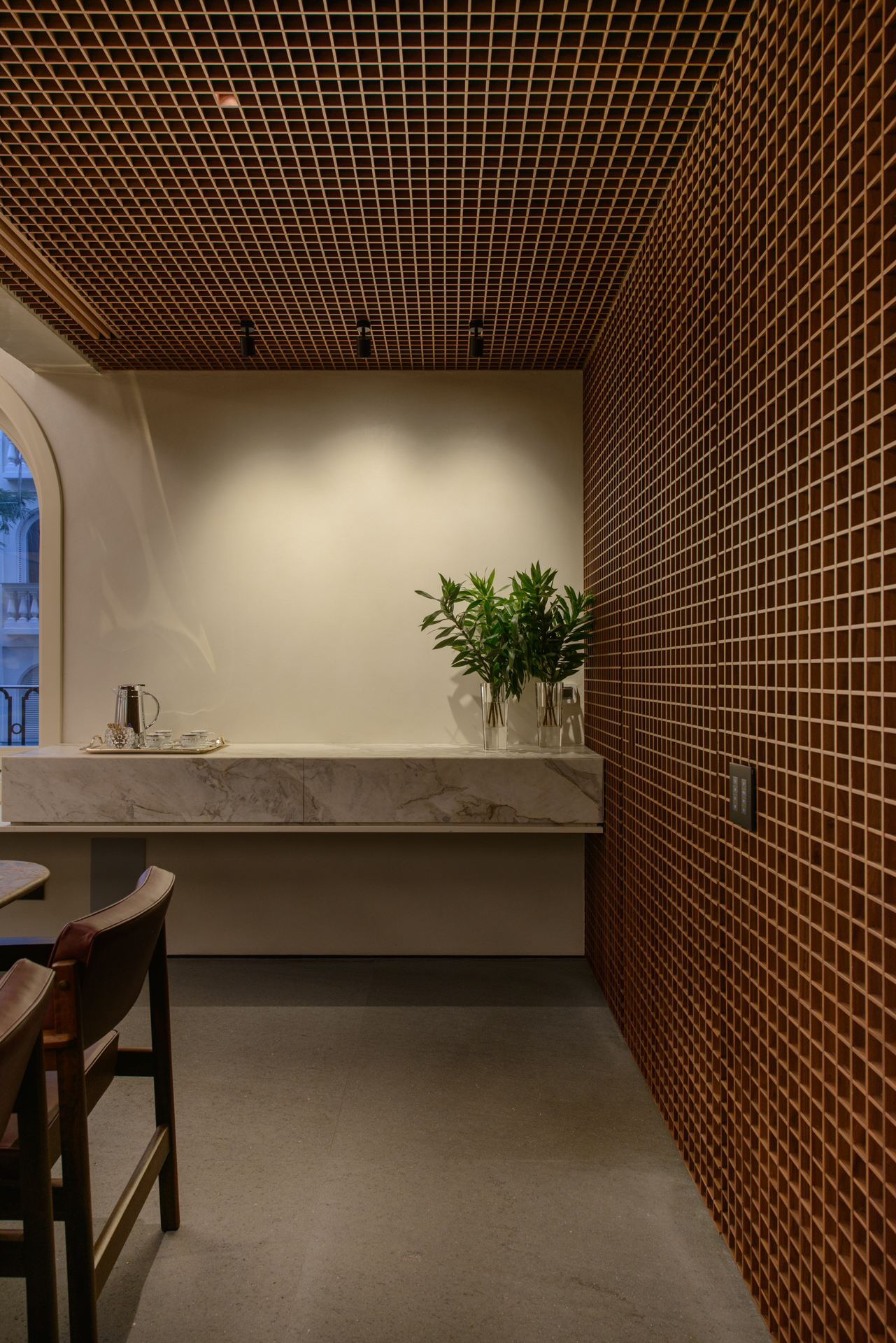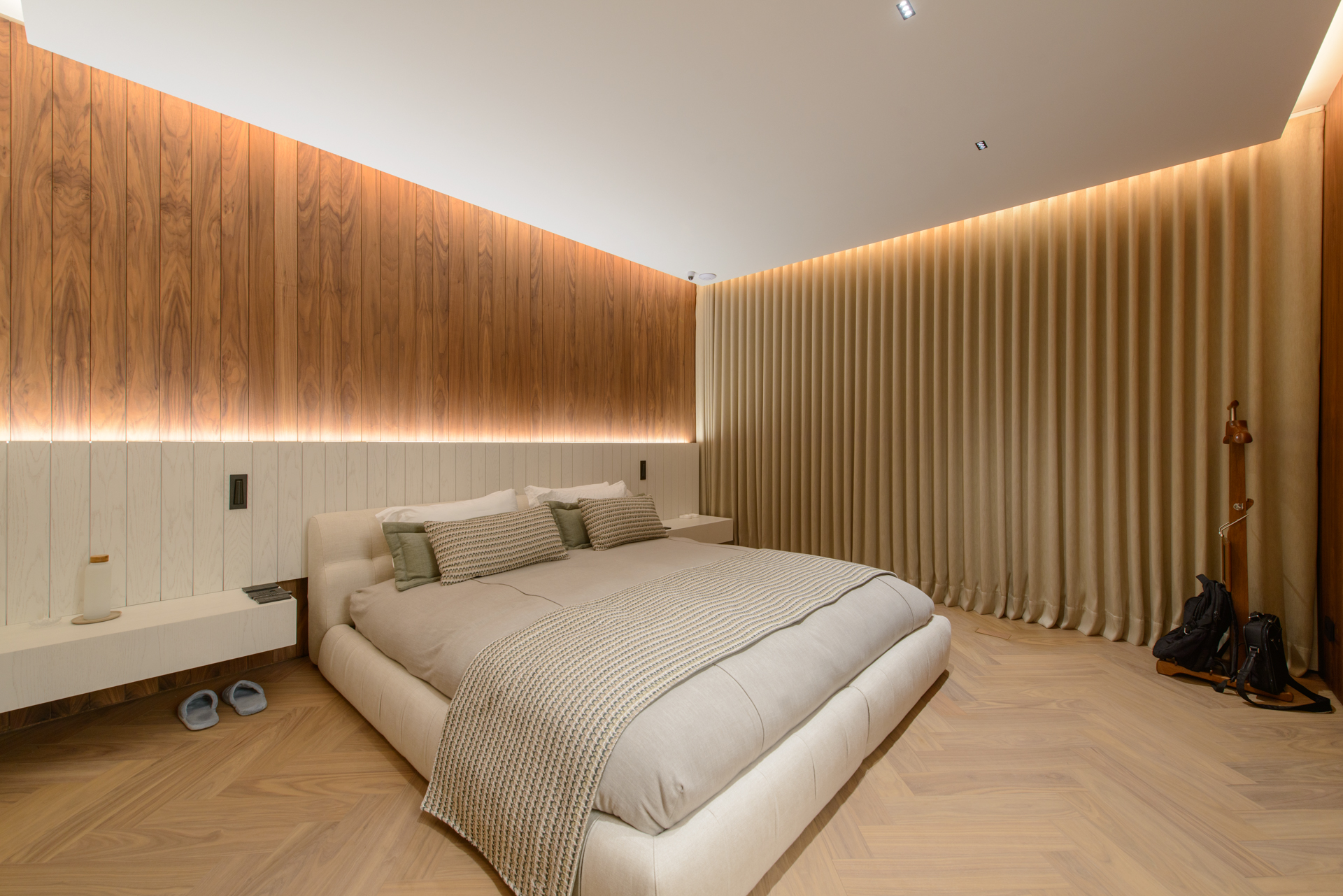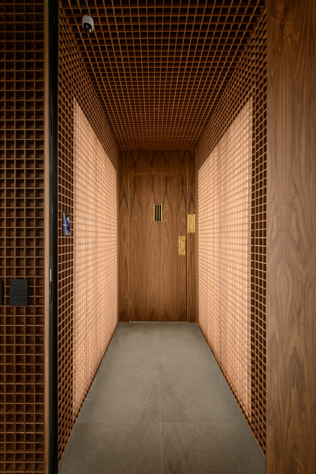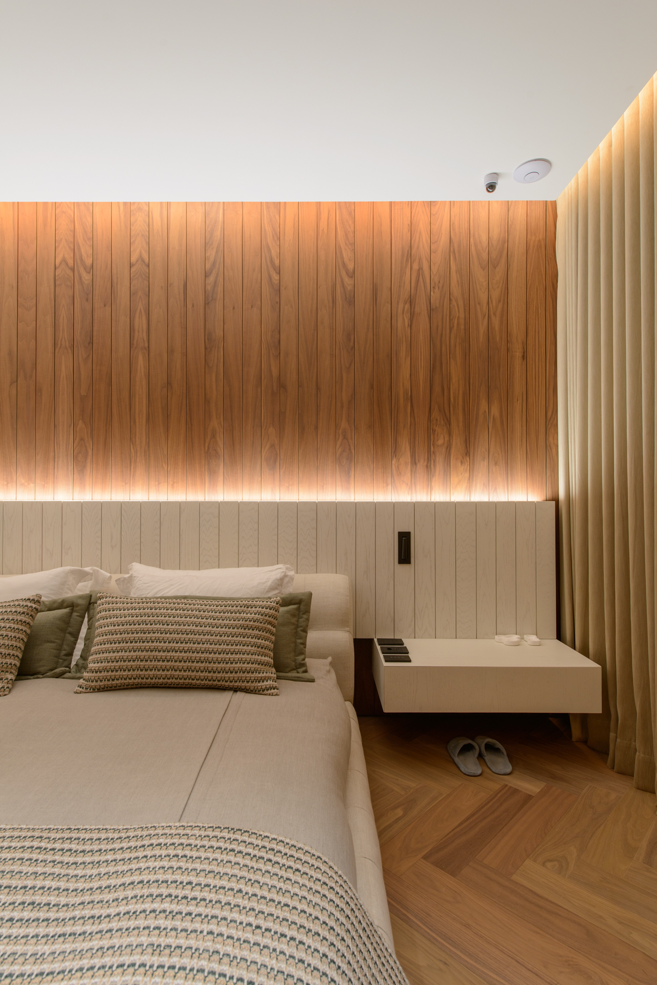 Painéis em madeira clara ganham profundidade com luz rasant que escorre suavemente pelas superfícies verticais.