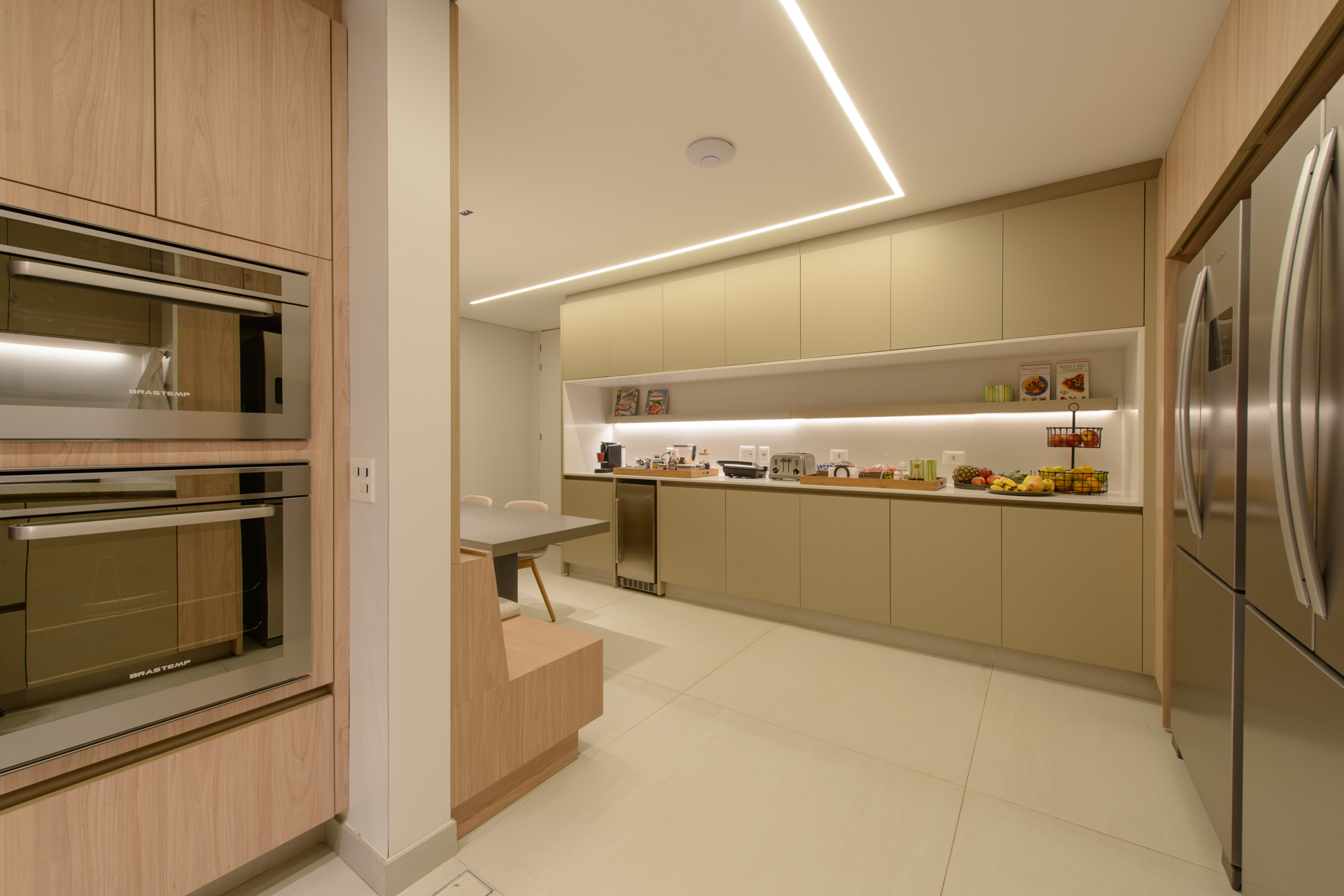 Cozinha com luz técnica e funcional integrada ao mobiliário, realçando a materialidade dos acabamentos.