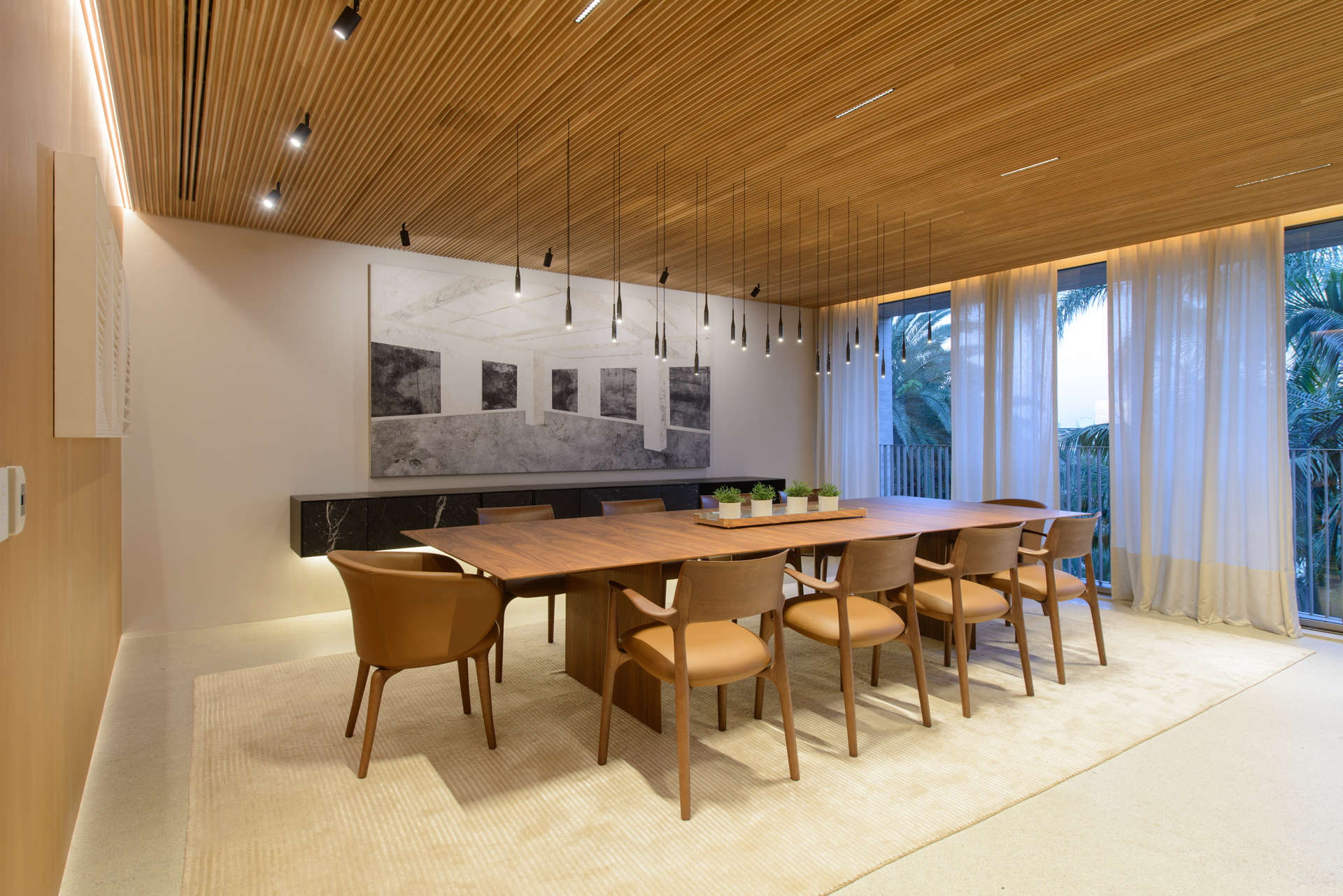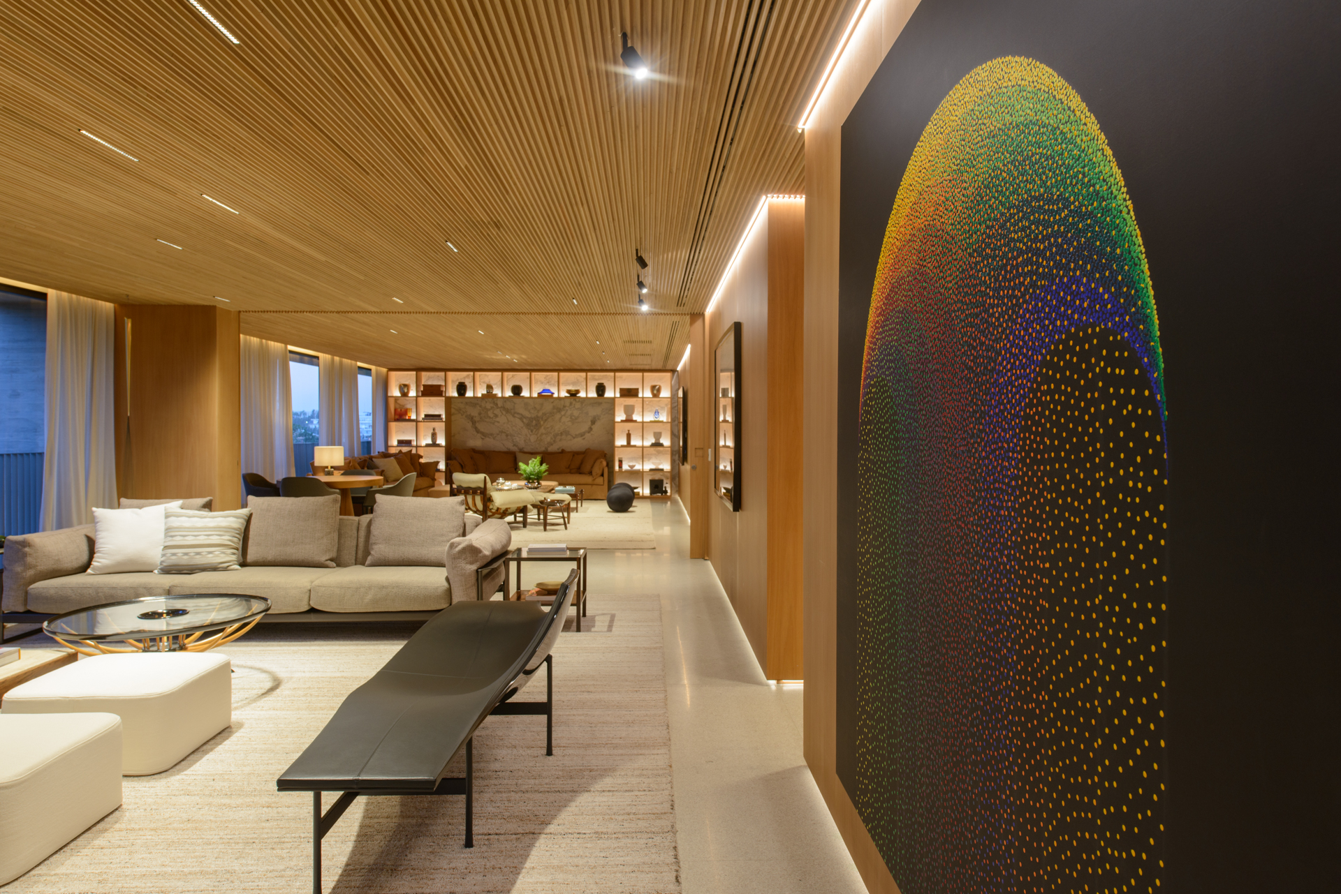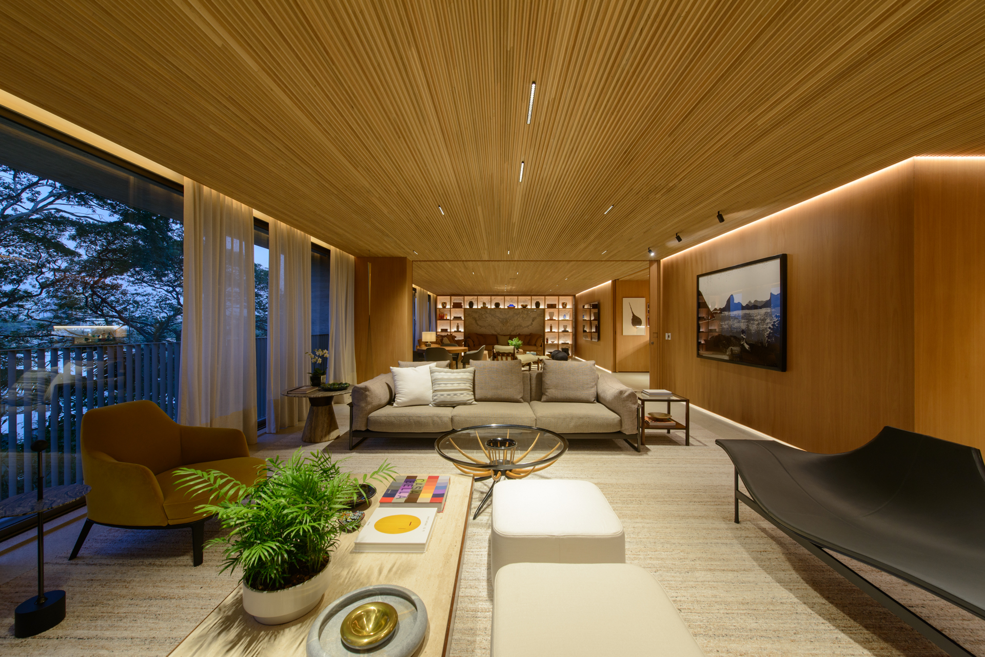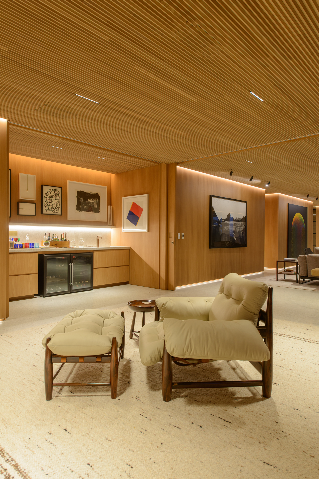 Rasgos lineares de luz embutidos no forro ripado guiam o olhar e ampliam a percepção espacial.