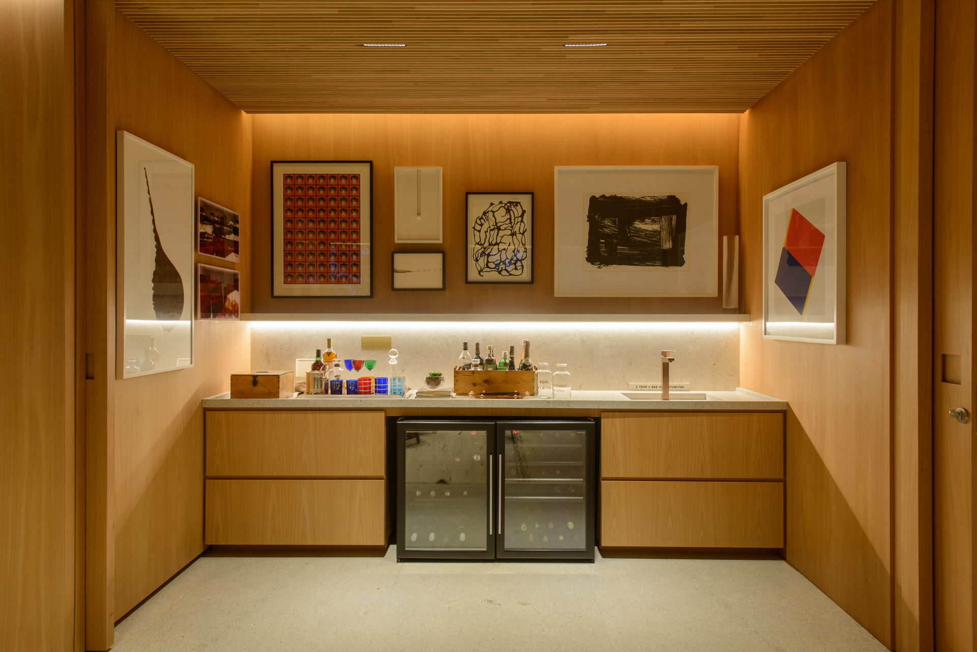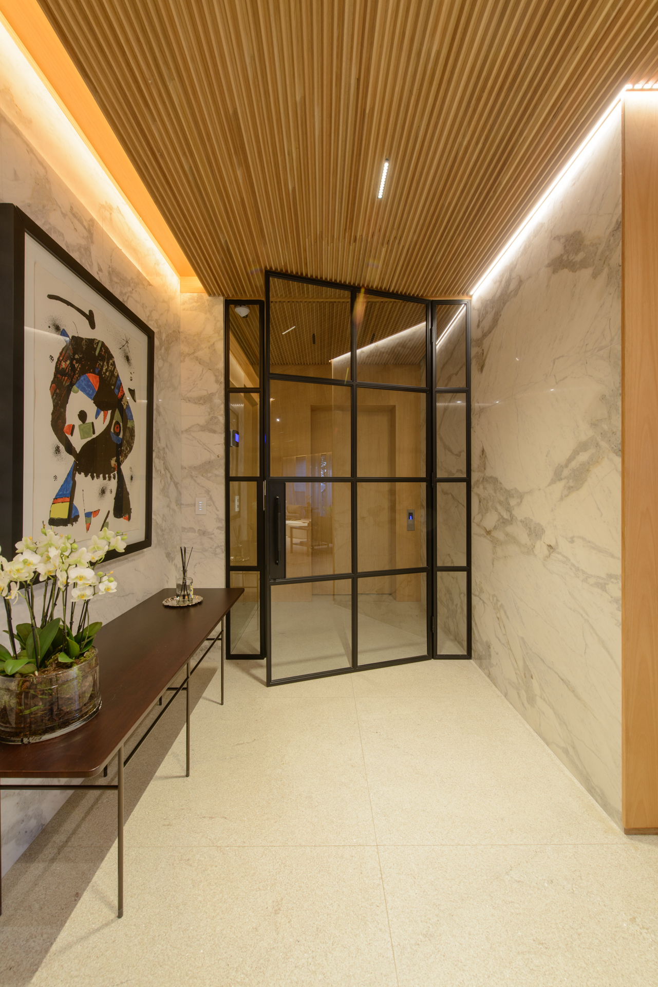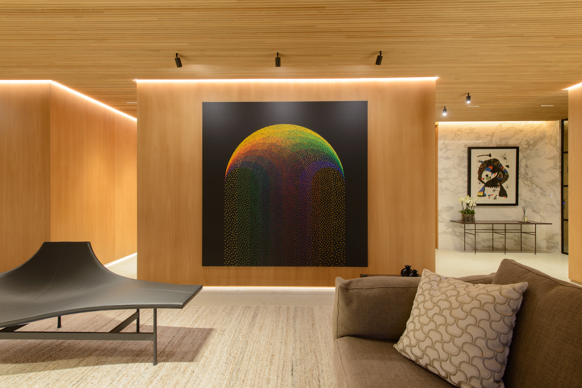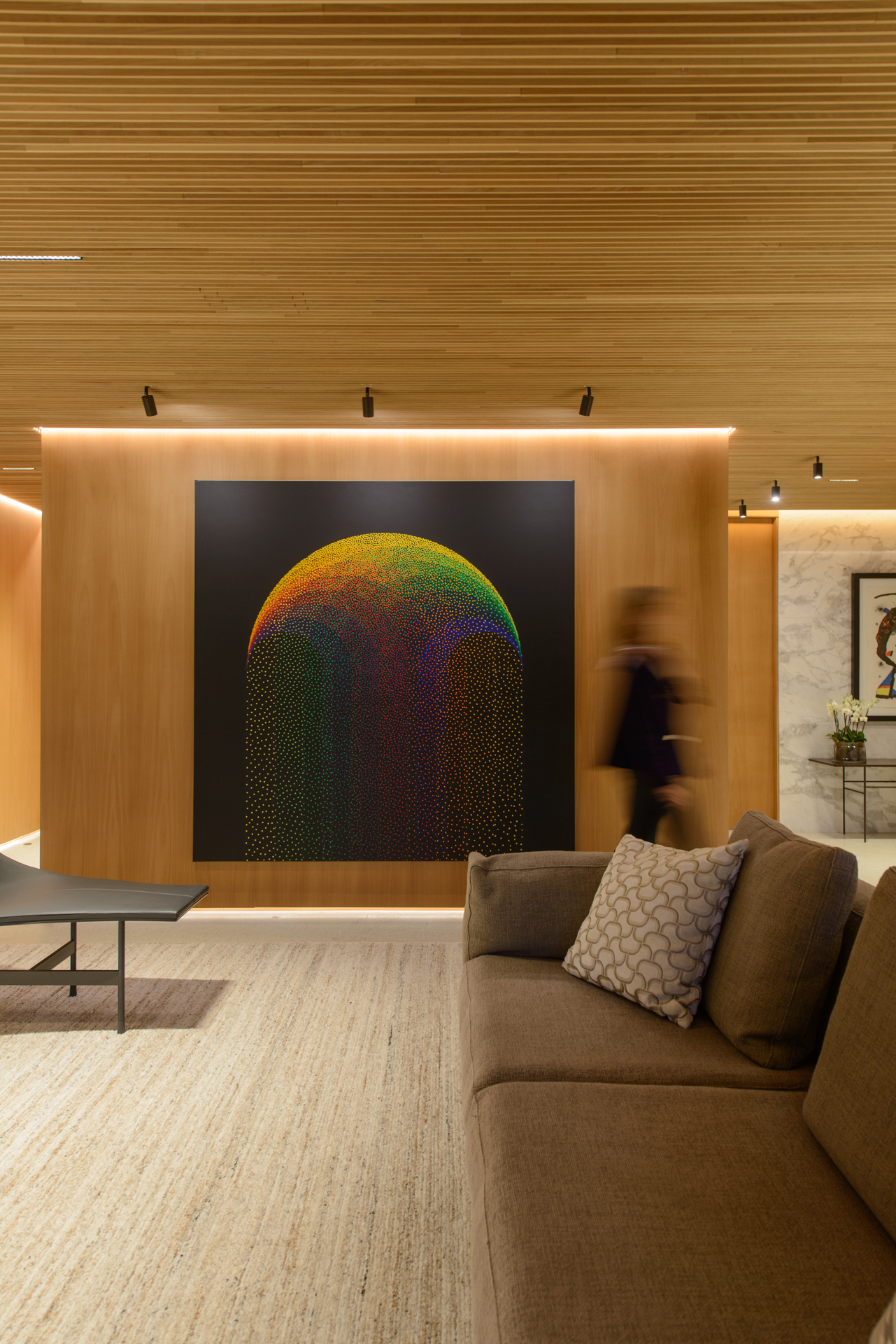 Rasgos lineares de luz embutidos no forro ripado guiam o olhar e ampliam a percepção espacial.