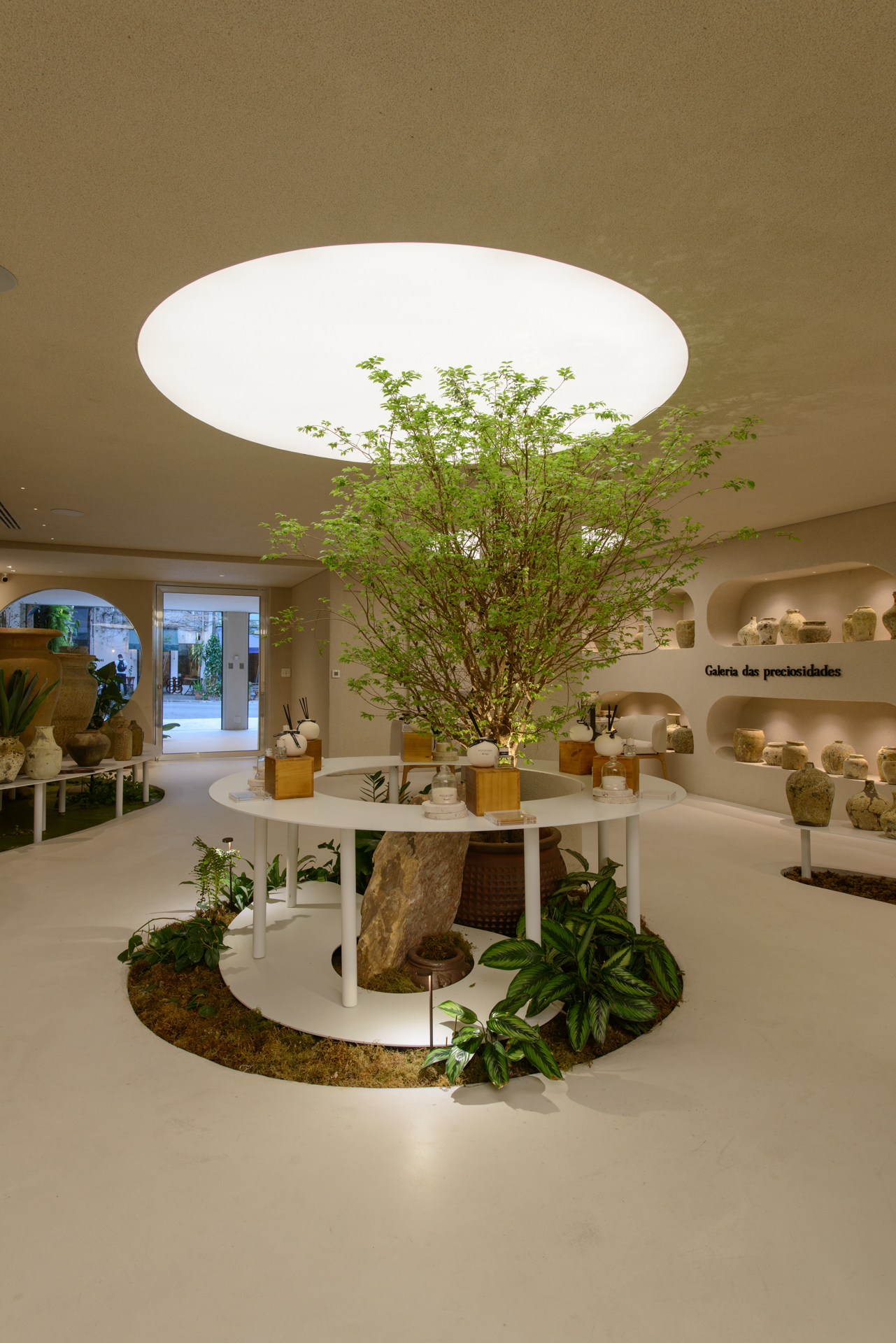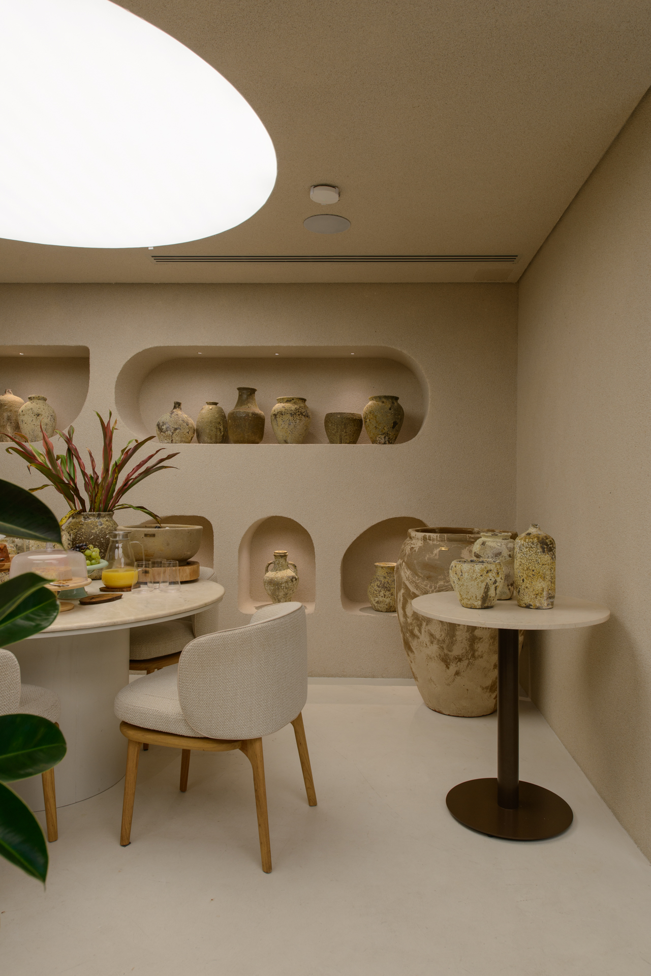 Neste território sensorial, cada feixe de luz atua como um contador de histórias. Entre volumes cerâmicos, fibras naturais e pedras brutas, a sombra se torna aliada — intensificando texturas, conduzindo o olhar e instaurando pausas visuais que acolhem.