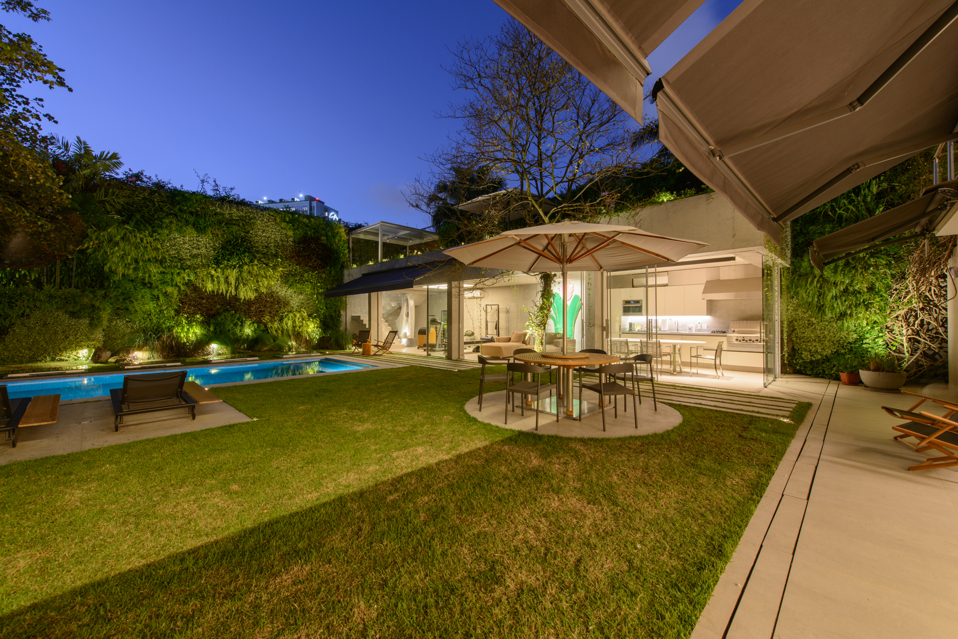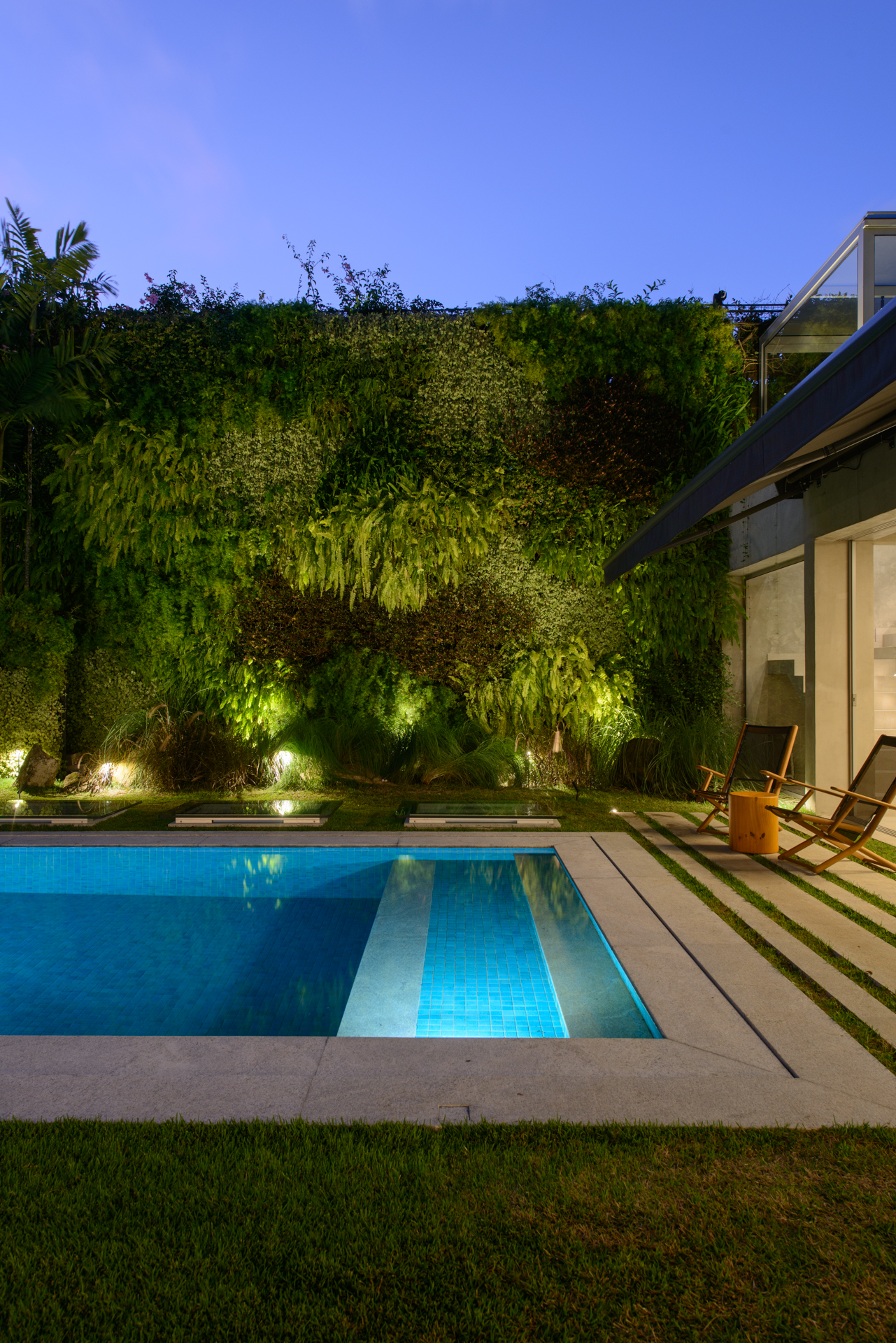 Jardim e área externa com piscina: projetores técnicos com fachos controlados valorizam a vegetação vertical e criam continuidade entre o interior e o exterior.
