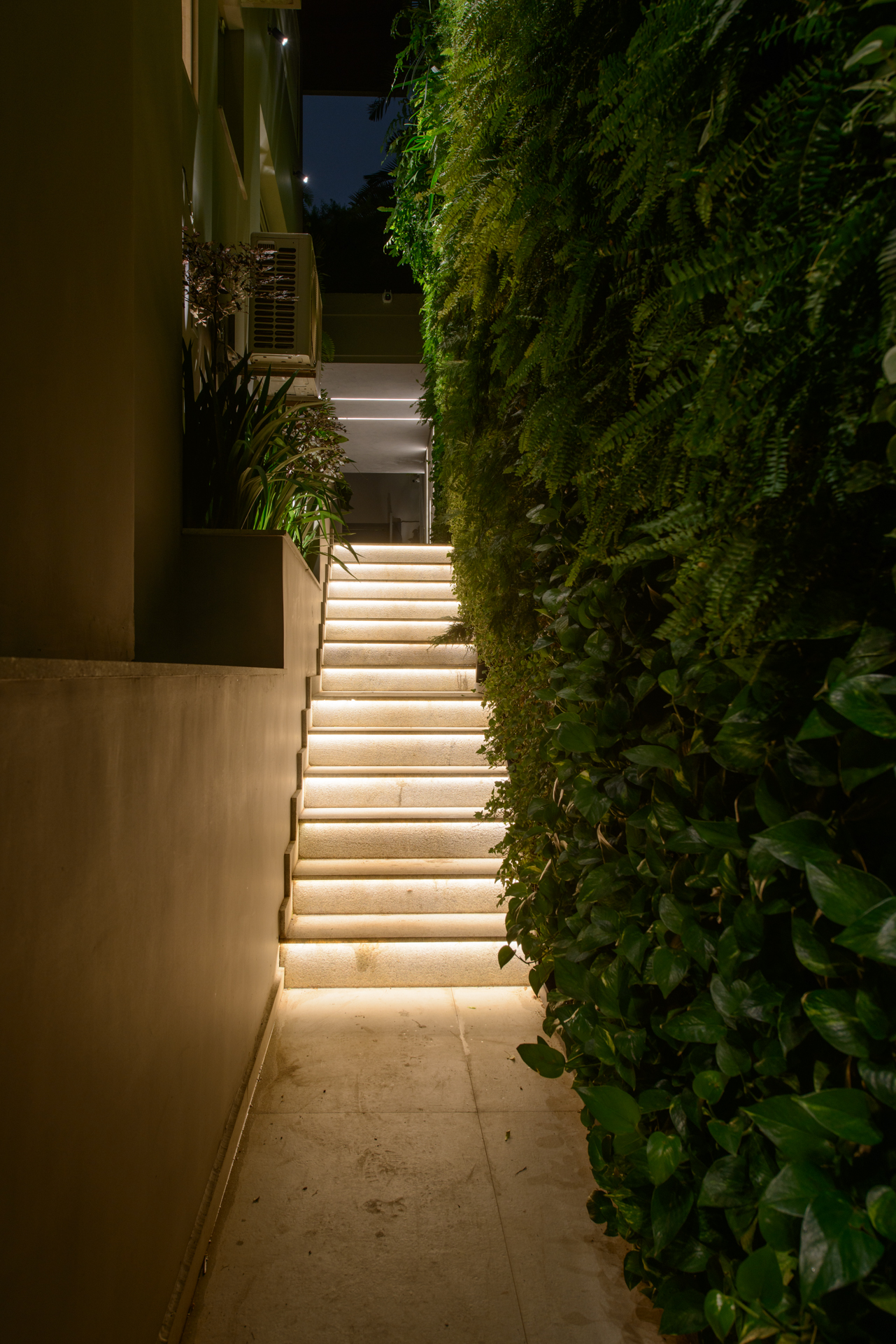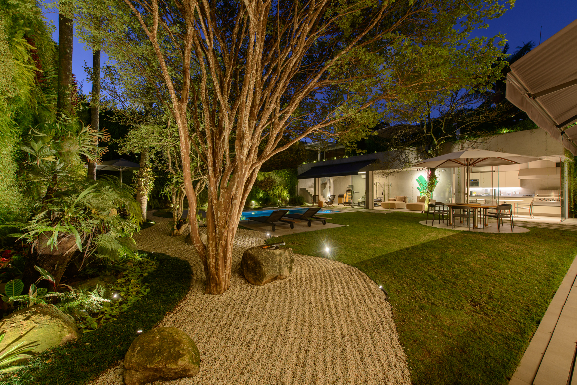 Em contraste, a área externa e social se abre ao jardim com iluminação cenográfica pontual, valorizando a vegetação e estendendo a percepção do espaço durante a noite.