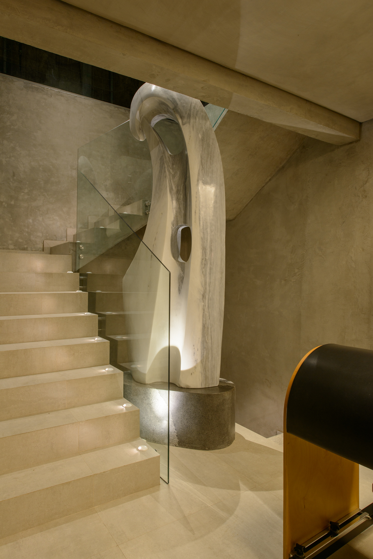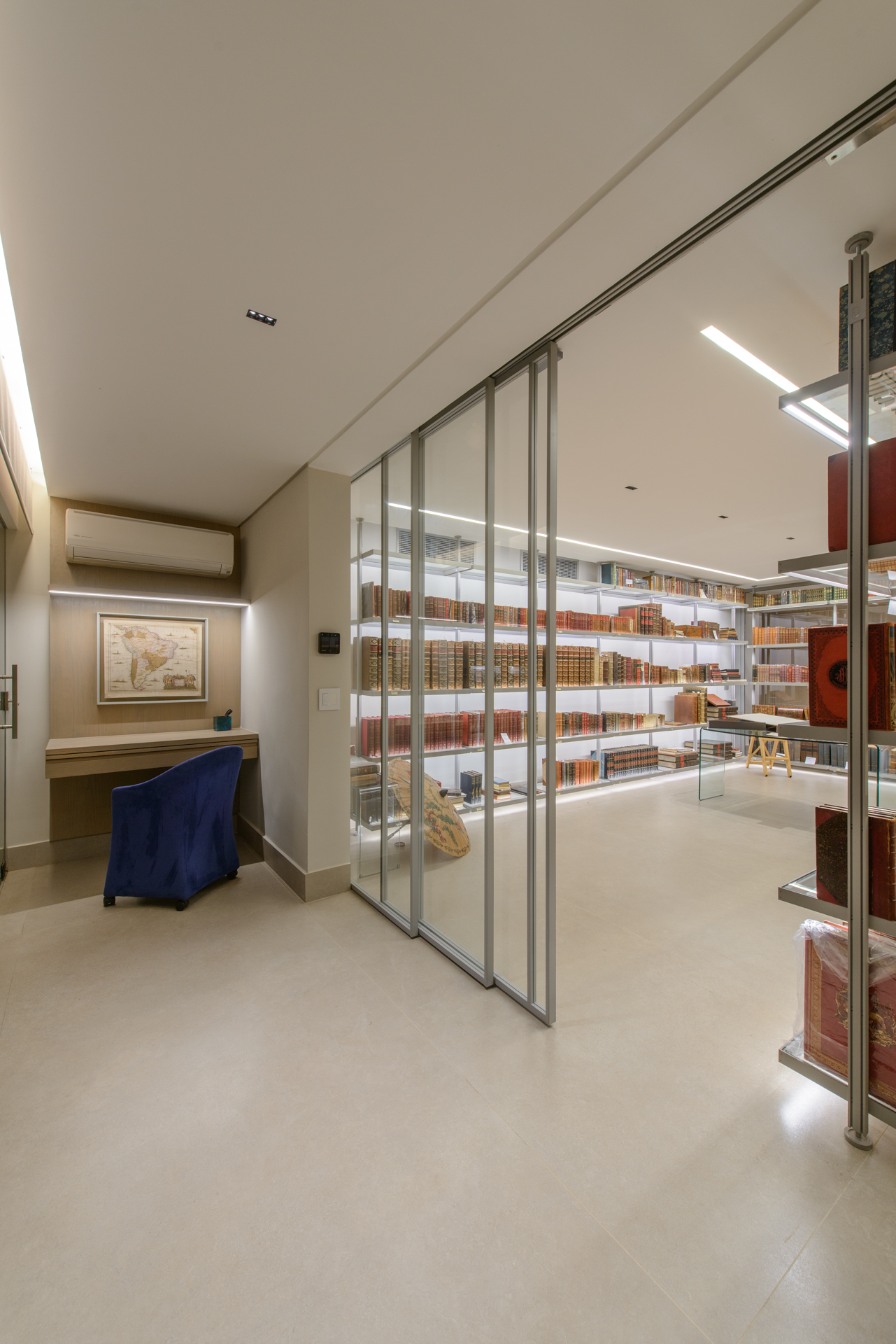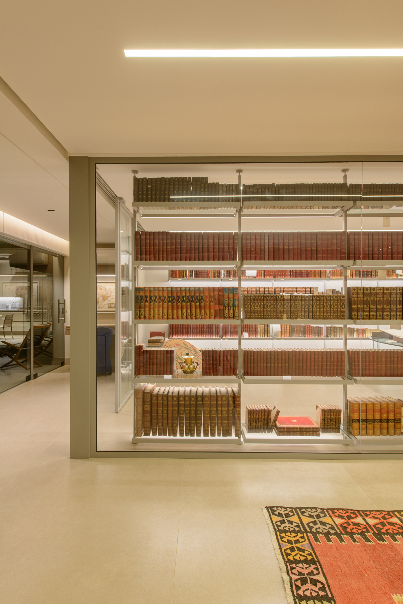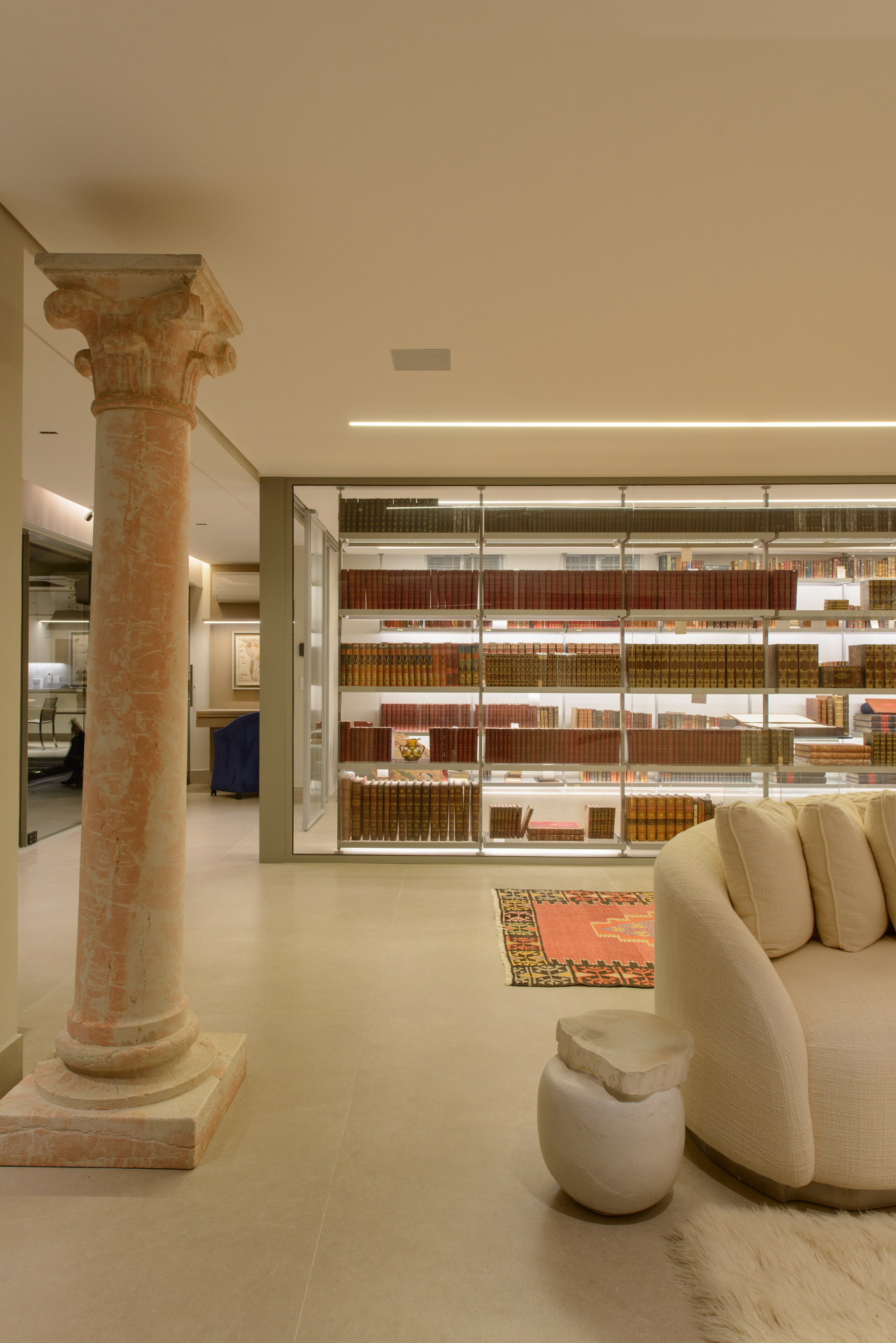 Entre ambientes sofisticados e discretos, a iluminação reforça o gesto arquitetônico, cria zonas de transição suaves e coloca em evidência o que é essencial: arte, literatura e permanência.