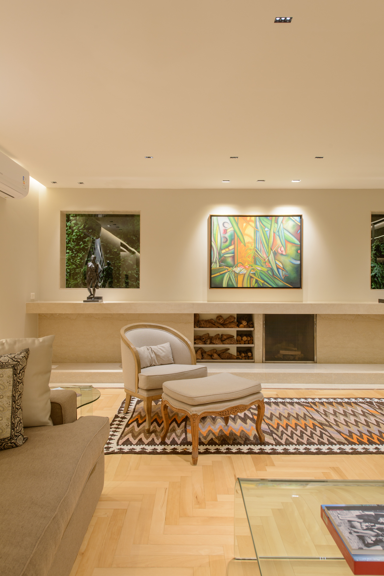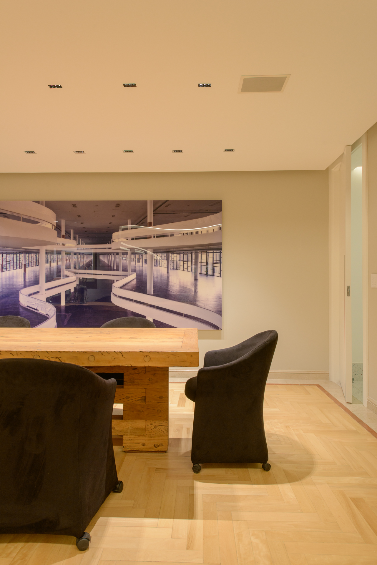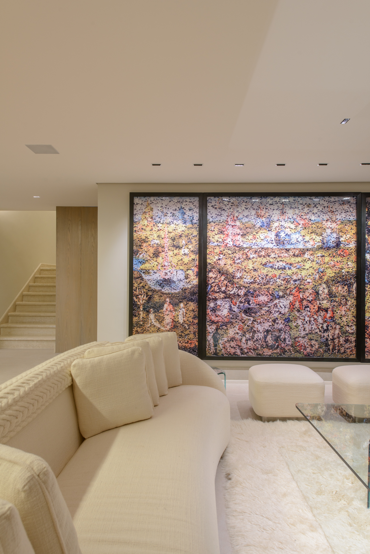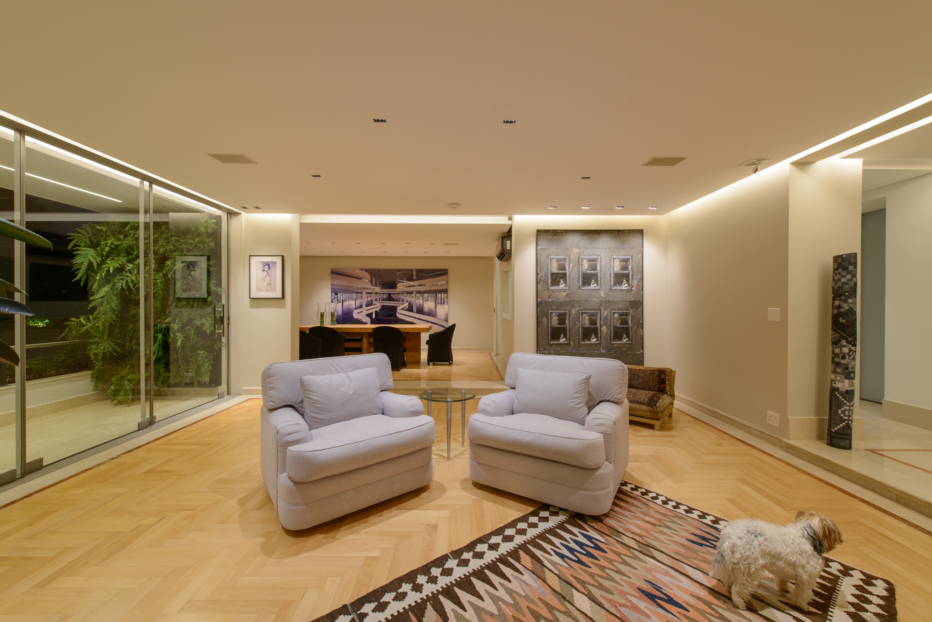Living e obras de arte: iluminação embutida com direcionamento preciso destaca o tríptico de Vik Muniz e outras peças de acervo, sem interferir na ambiência ou criar ruído visual.