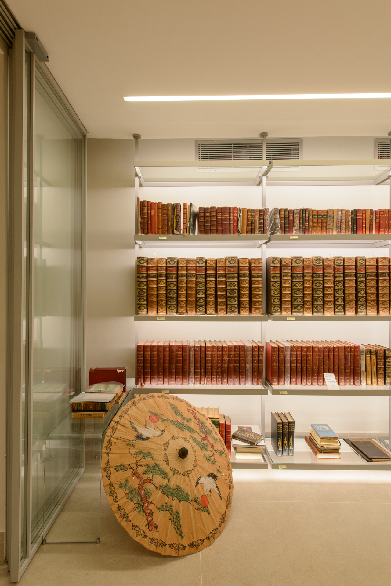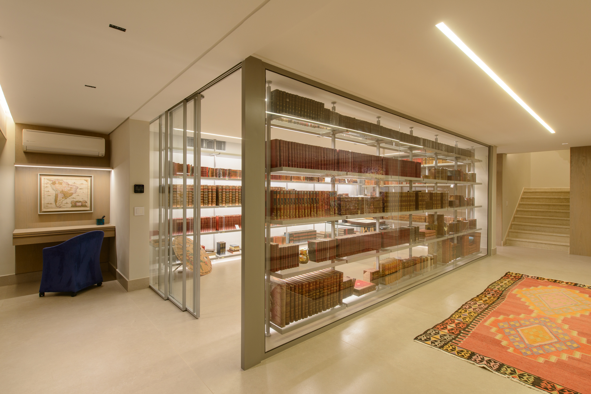 Biblioteca envidraçada: prateleiras retroiluminadas com luz neutra e difusa criam uma atmosfera museológica, revelando volumes raros com controle de ofuscamento e uniformidade.