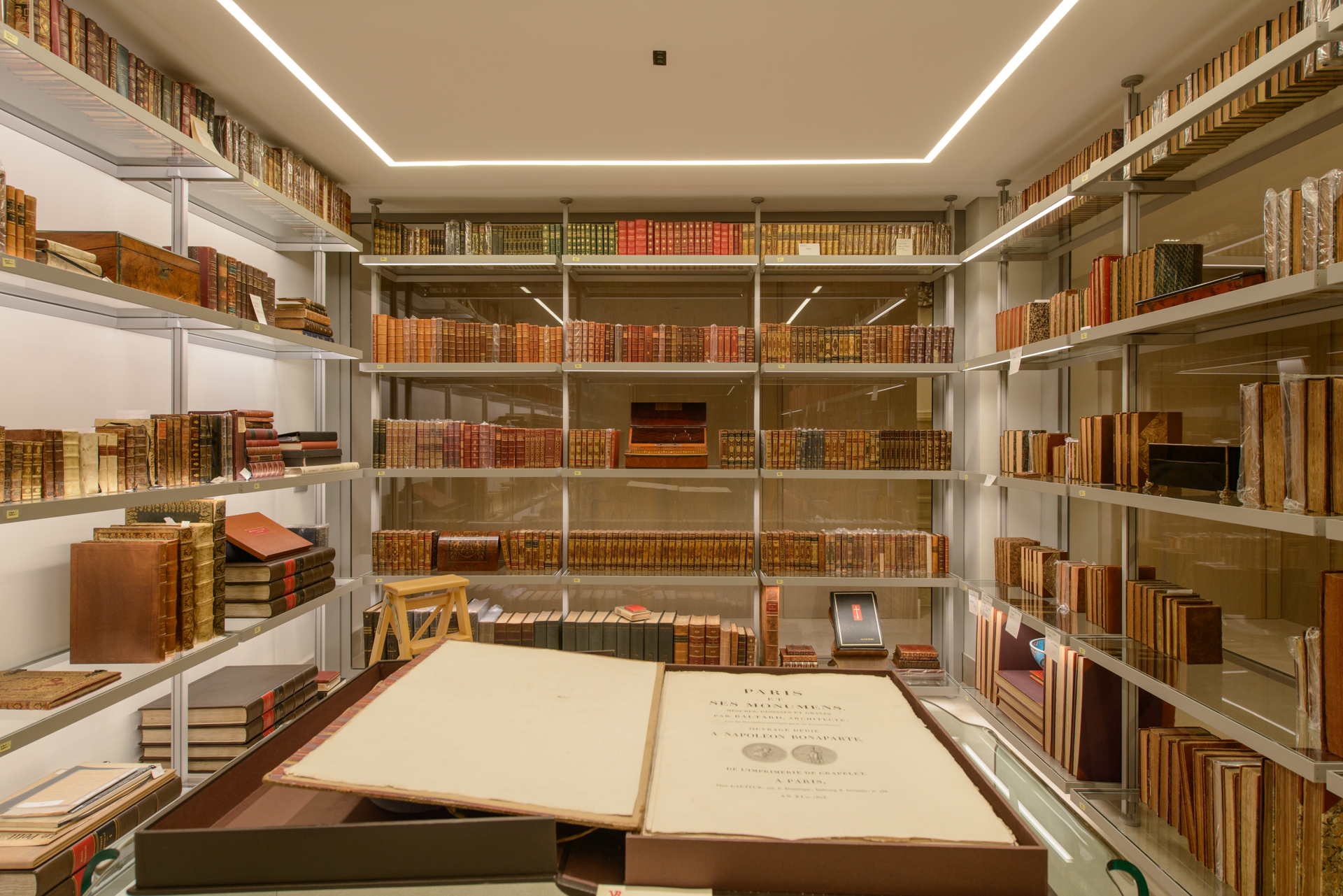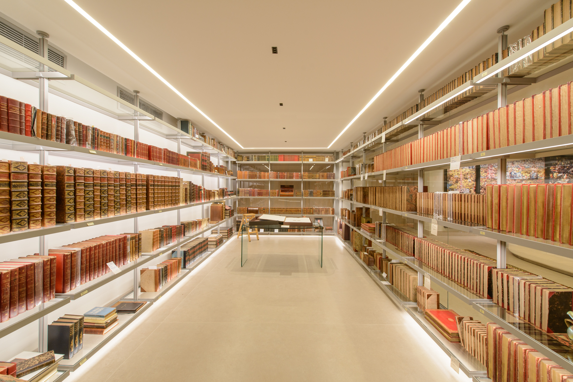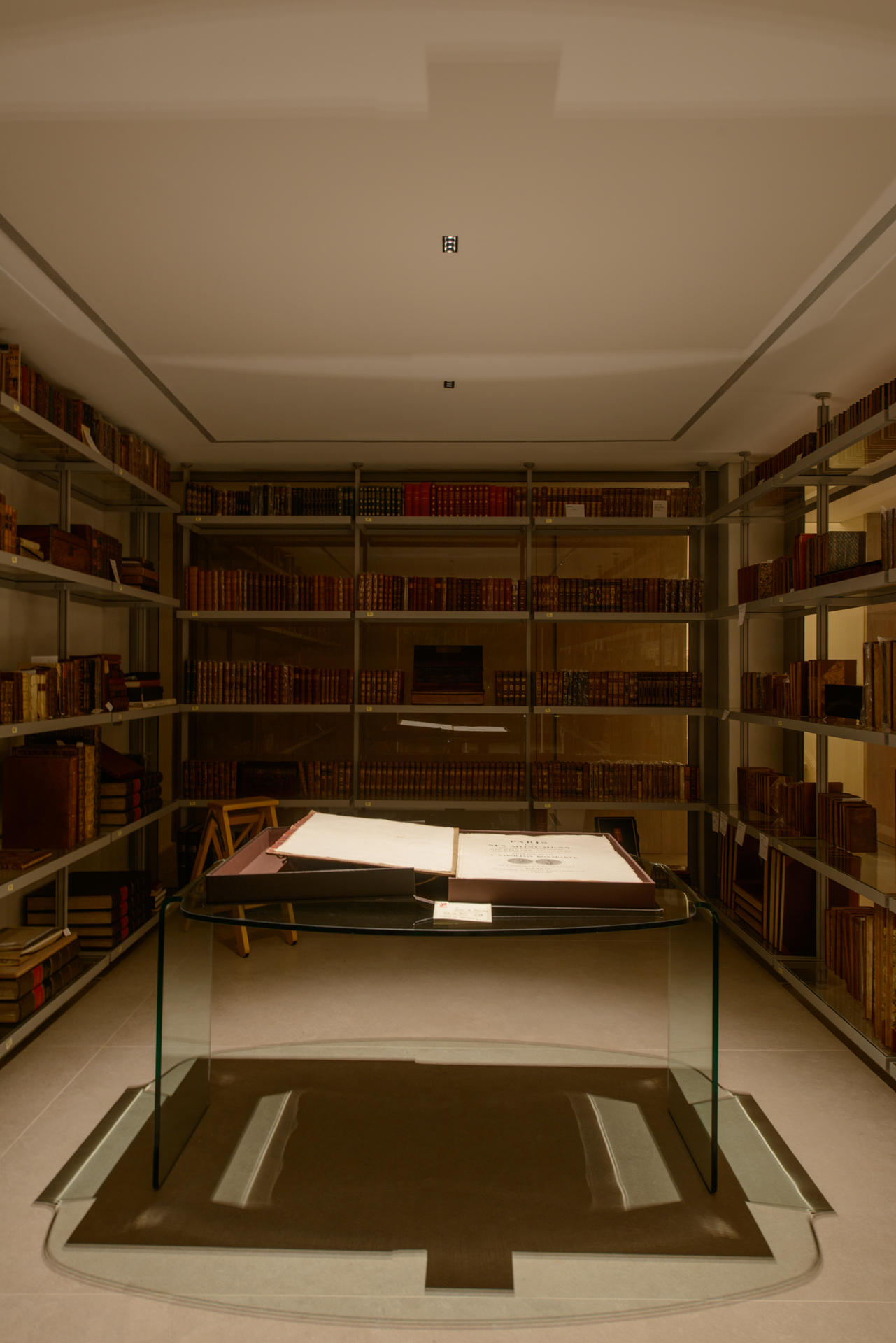 Na biblioteca — ponto central do projeto — a iluminação técnica com alto IRC (>90) valoriza cada detalhe das primeiras edições originais em francês, enquanto cria uma aura de preservação e nobreza.